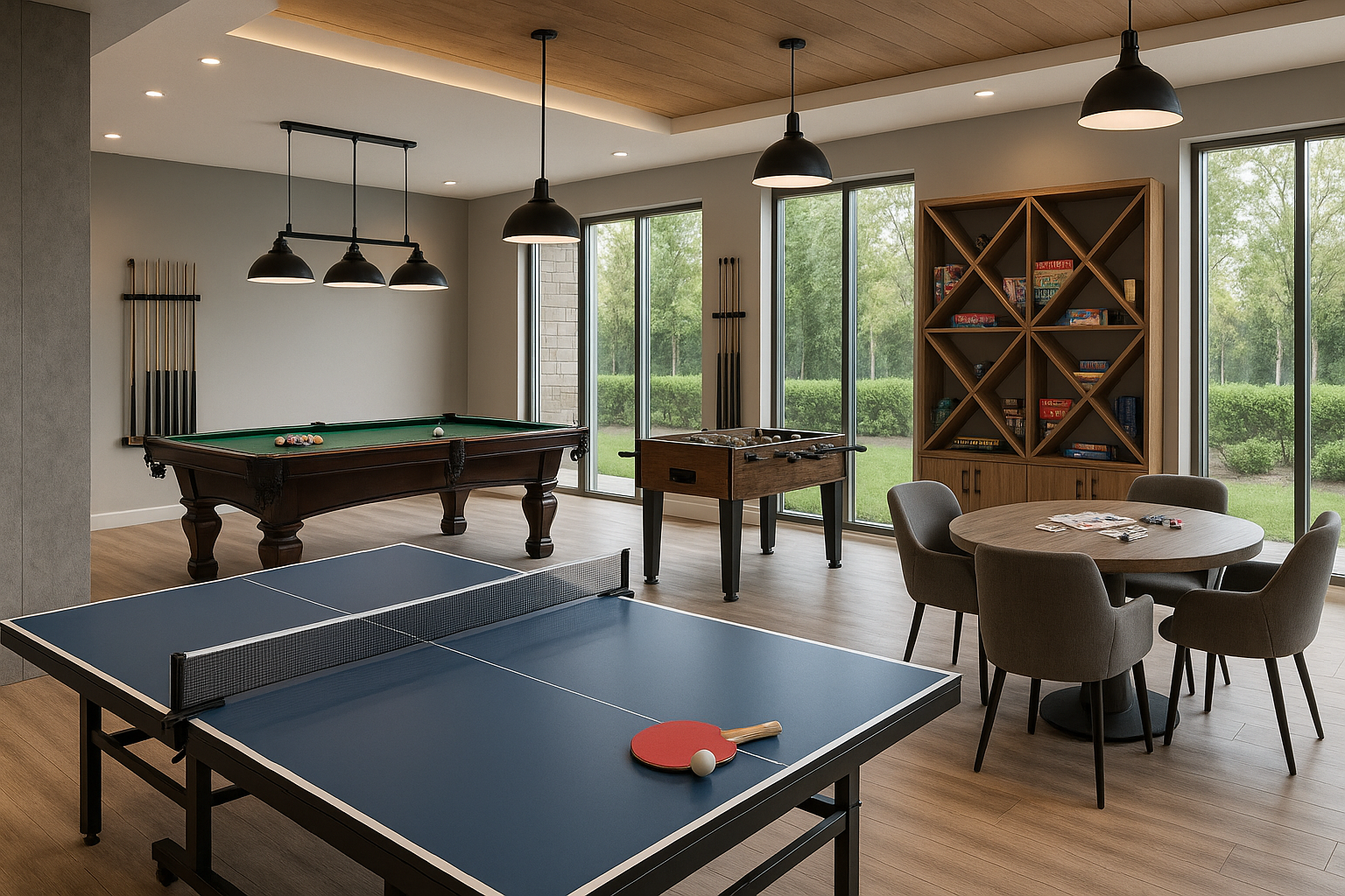 The clubhouse play area features pool table, table tennis, and other indoor games perfect for family moments, friendly matches, or relaxed solo moments.